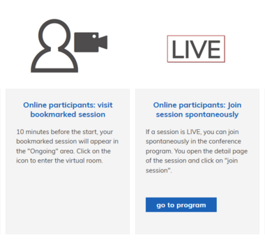 Log in to ‘my conference tool’ and go to the presentations you have bookmarked. Approximately 10 minutes before the event, you will see a figure with a camera. Click on the symbol and you will be redirected to the webinar.